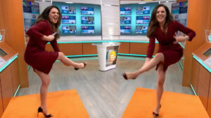 During the live broadcast, popular weather presenter Laura Tobin surprised the entire studio with a moment nobody saw coming. While standing in front of the weather screen, she suddenly lifted her leg high into the air and pretended to strum it like a guitar. Yes… you read that right—her leg became the guitar!