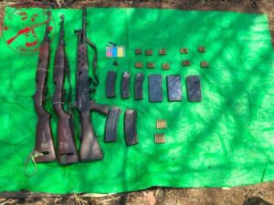 ဓာတ်ပုံ – တိုက်ပွဲအတွင်း သိမ်းဆည်းရမိသည့် သေနတ်နှင့် ခဲယမ်းအချို့ ။မကွေးတိုင်း ၊ စေတုတ္တရာမြို့နယ်အတွင်းရှိ ဂိတ်စခန်းတခုကို တိုက်ခိုက်ခဲ့ရာ နေပြည်တော်စစ်တပ်ဘက်မှ တပ်သား ရှစ်ဦးသေဆုံးခဲ့ပြီး ထိခိုက်ဒဏ်ရာရသူအများပြားရှိကြောင်း ချင်းကာကွယ်ရေးတပ်ဖွဲ့ – အရှို(CDF – Asho) က ပြောသည်။